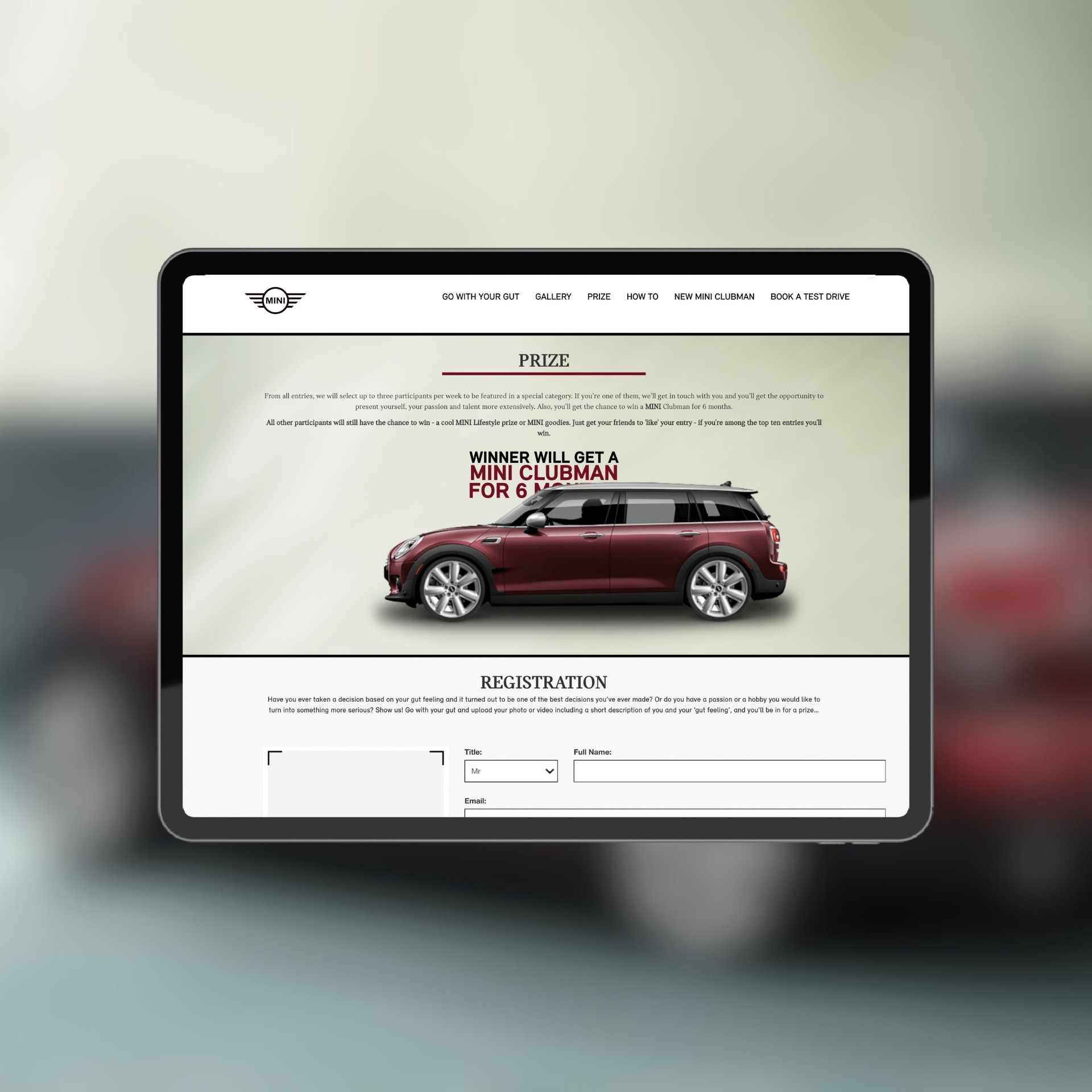 A dynamic landing page for the "Go With Your Gut" marketing campaign, encouraging users to share videos with their Mini Cooper for a chance to win a Mini Clubman for 6 months.